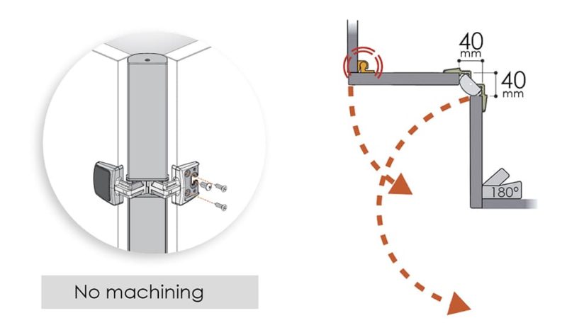 Rincomatic_Plus40 corner hinge is installed using the screws included in the sales kit, without any machining on the doors.