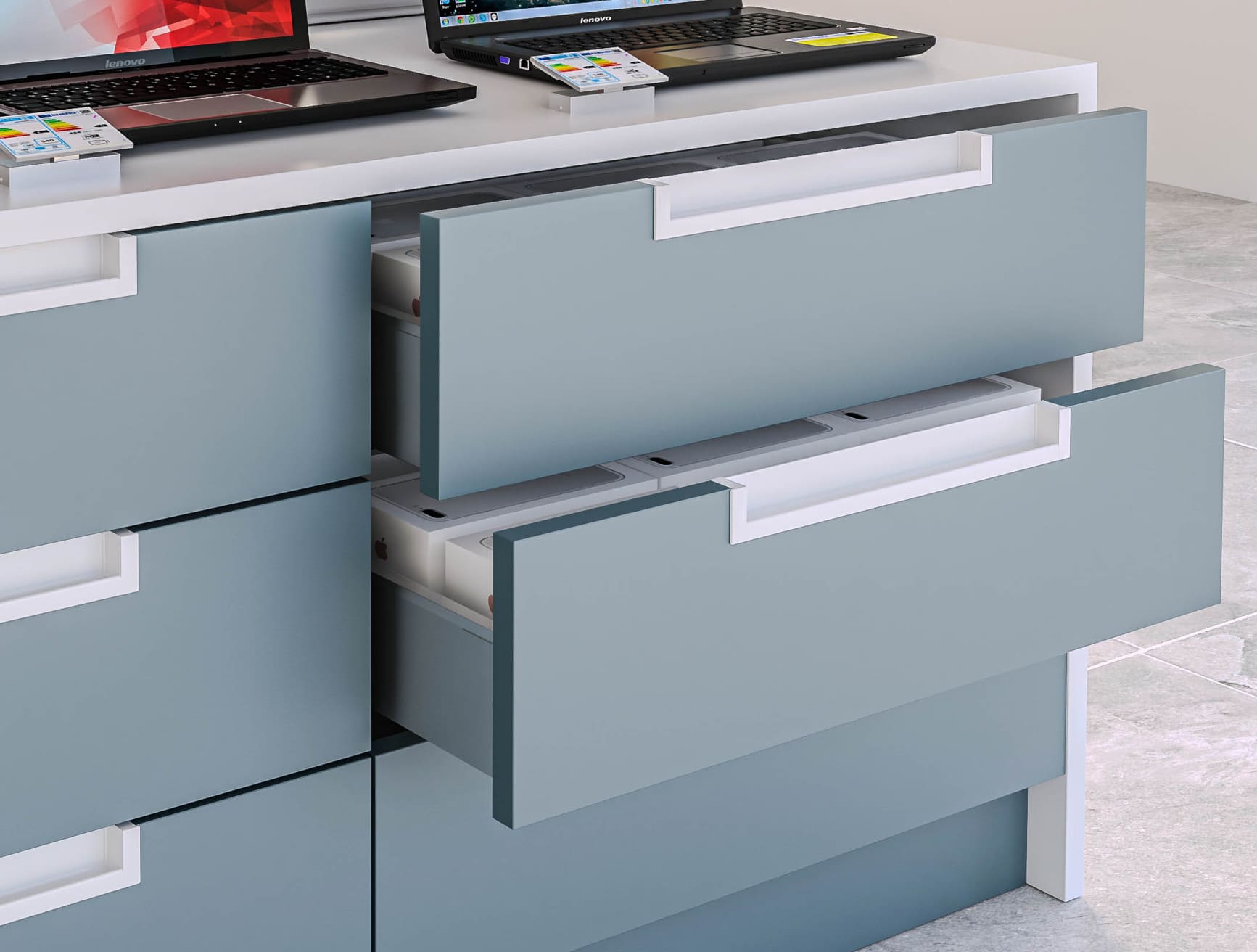 Se pueden adquir sus componentes por separado o tiradores completamente terminados y listos para su instalación sobre el frente o cajón.