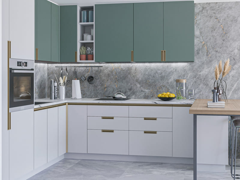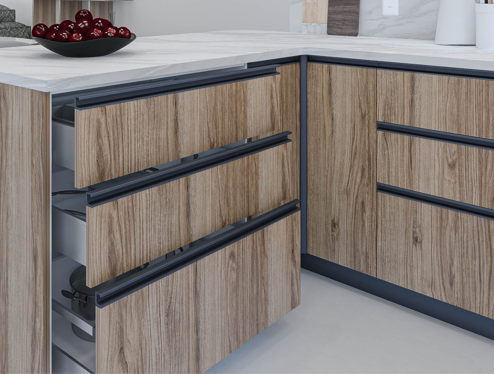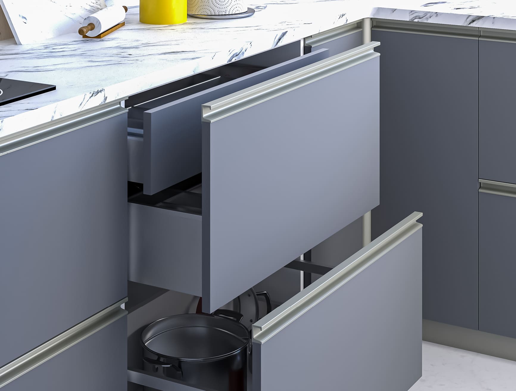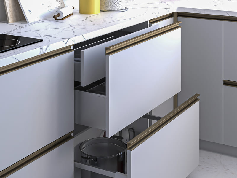 El tirador de perfil SymaG-32 permite conseguir ambientes de cocina modernos estilo Gola, optimizando al máximo el acceso al interior del mueble. Su diseño en forma de “G” facilita la apertura de puertas y cajones a través de un agarre interior.