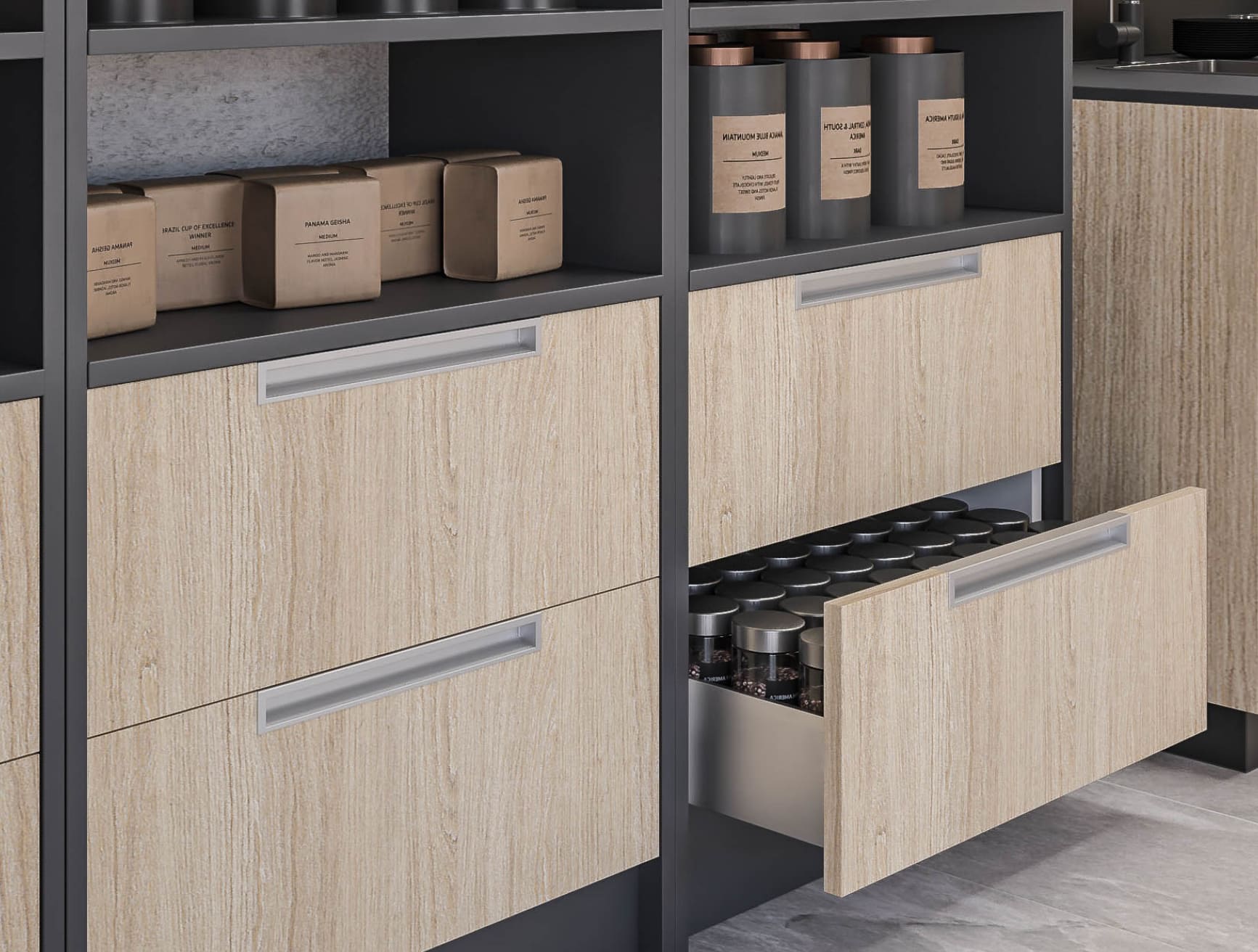 Los tiradores de perfil Syma cuentan con terminales embellecedores que hacen posible cubrir las aristas vivas de aluminio tras el corte de perfiles, proporcionando un tacto suave a los extremos y una fácil limpieza. Se pueden adquir sus componentes por separado o tiradores completamente terminados y listos para su instalación sobre el frente o cajón.